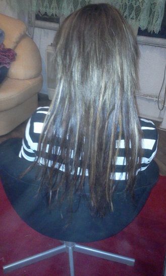 Barbara haja készülőben . saját hajat hozott (50cm) feketét, ezt kiszőkítettem ,majd átfestettük világos barnára,